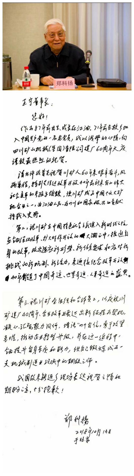 原中組部副秘書長(zhǎng)、中央政策研究室副主任鄭科揚(yáng)專門為川礦集團(tuán)六十周年華誕發(fā)來的賀信